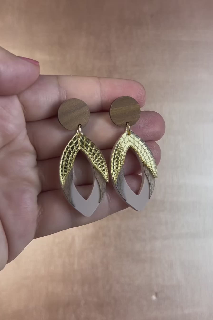 A pair of stylish handcrafted earrings with wooden circular studs and layered geometric dangles featuring gold, brown wood, and light beige accents in premium acrylic glass, displayed on a textured cream-colored dish.